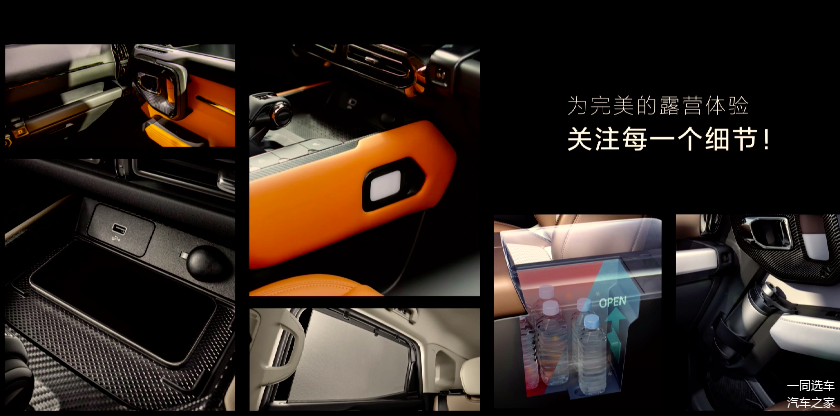 与此同时,新车基于2000+用户使用习惯调研,全车保留了近20个常用功能按键;对车内越野门把手进行了强化,最大承载拉力45kg;副驾位置还配备了一个可以拆卸的便携驱蚊灯;扶手箱内接通了空调出风口,可制冷制热……从这些细节上来看,二代大狗基于本身定位,非常注重户外用车体验,这也与同价位其他车型区别开来。
