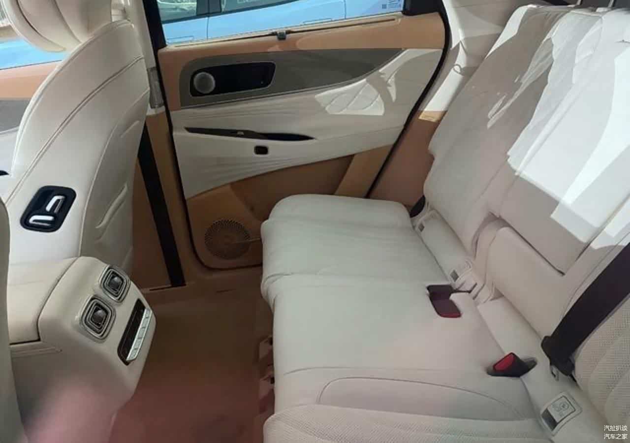 内饰方面,座舱内中控台采用三明治式面板装饰,搭载24.6寸曲面屏+50寸AR-HUD超大屏与仪表形成整体且带有弧度,配合三幅平底的方向盘,风格干练。前侧地台下方采用镂空设计,看起来比较有档次感。