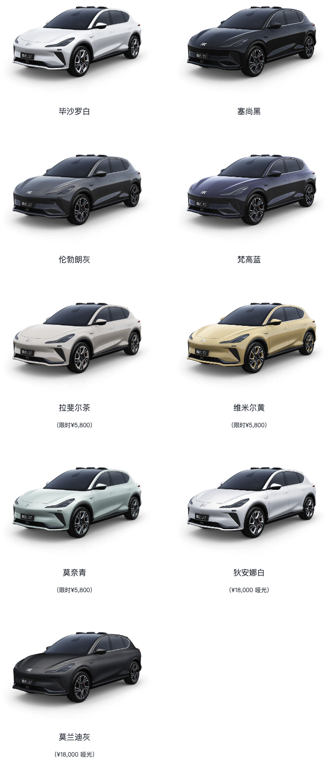 一款车是否好看,配色和轮毂非常重要。智己LS7提供9种配色,分别为毕沙罗白、塞尚黑、伦勃朗灰、梵高蓝、拉斐尔茶、维米尔黄、莫奈青、狄安娜白和莫兰迪灰,除了前三款颜色,后面6款颜色均需要付费选装,其中莫兰迪灰为1.8万元,另外5款为5800元。轮毂方面,则有20英寸和22英寸两种,如果想从20英寸升级为22英寸,需要支付1.28万元。