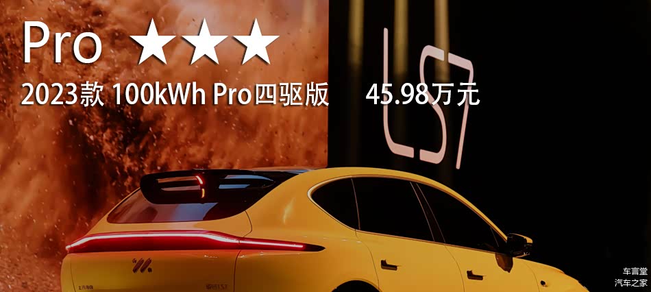 最后是Pro车型,为全系的顶配车型,双电机四驱搭配100kWh电池,CLTC纯电续航为625公里,官方指导价45.98万元,比Lux 四驱版贵6万元。配置上多了像素式可编程大灯、自适应远近光灯、2个激光雷达、Carlog车载摄像等。这款车主要承载了车系旗舰的形象,如果更看重日常使用可以考虑其他配置。