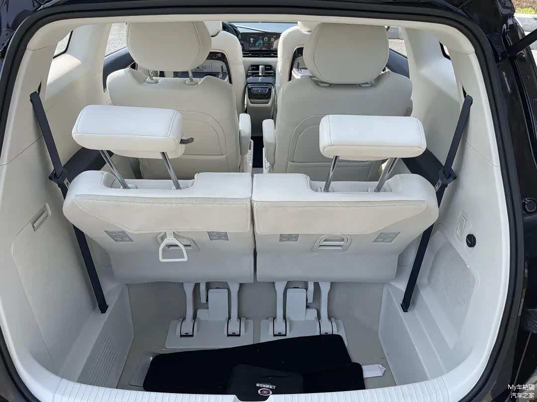 二排座椅是凯捷混动的“重头戏”部分,座椅支持560mm的前后手动滑动、160mm的左右手动滑动,以及靠背和腿托的电动调节,可实现多样的乘坐体验。至于后排独立空调、USB充电接口、语音控制等功能也都配齐,能营造出不错的尊贵感。值得表扬的是,第三排座椅在不用的情况下,可以直接收入底部,与车厢底部形成纯平,有效地提升空间利用率。