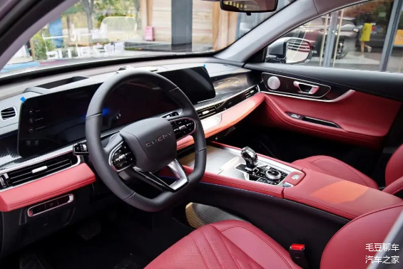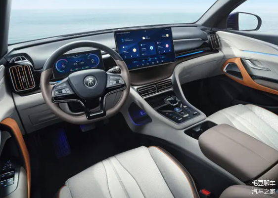 比亚迪宋Pro DM-i内饰采用比亚迪家族式设计风格,在用料和做工方面让人很满意,中控具有8.8寸液晶仪表和12.8寸中控屏,搭载了智能网联系统,在线支持导航,语音互动,车联网等功能,方向盘为皮质方向盘,采用了上黑下灰的拼接设计,座椅采用仿皮材质,亮白色配色搭配棕色修边,看起来很运动。
