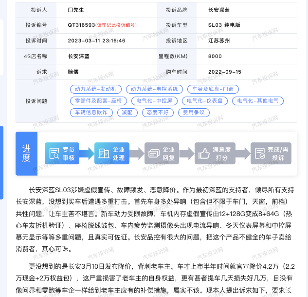 还有的就是经典的车机芯片的范畴了。毕竟广告可以被发现,但是如果车机芯片不注意的话,是不会知道有没有问题的。小编在汽车投诉网上就发现来关于长安深蓝SL03纯电版厂家虚假宣传车机内存配置的问题。据来自江苏苏州的闫先生表示:“新车动力受限故障,车机内存虚假宣传由12+128G变成8+64G(热心车友拆机验证)、座椅脱线鼓包、车内疲劳监测摄像头出现电流异响、冬天仪表屏幕和中控屏慕无显示等等多重问题,且真实可佐证。”