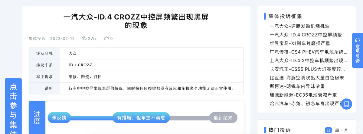 除开以上两个车机系统的“大雷”,车机卡顿死机也是不可忽视的地方。小编在汽车投诉网发现关于“一汽大众-ID.4 CROZZ中控屏频繁出现黑屏的现象”已经有13宗集体投诉了。消费者花大几十万买辆车遇到各种各样大问题怎么会不糟心。对此大众也表示开始对这套系统进行修复,预计3.0版本的软件将在2022年冬季通过OTA方式为车主更新。但依然收到了不少车主的投诉。