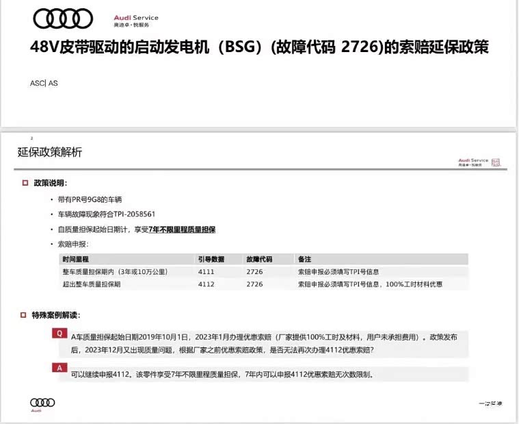 3月5日,相关内部人士透露了一条关于48V电机索赔延保的官方政策,其中提到相关涉及车辆可享受电机的7年不限公里质量担保,为此,笔者致电一汽奥迪400官方客服电话询问情况,客服表示,“目前没接到过奥迪A6 Allroad车型发动机缺缸、48V电机故障的问题反馈,官方对此也没有发布任何相关维修政策及延保政策,且对于您提到的出保后是否能索赔零部件问题我们不做任何假设性回复”。