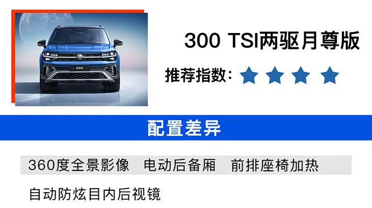 300TSI 两驱月尊版车型售价为19.76万元,配置上增加了360度全景影像、电动后备厢、前排座椅加热、自动防炫目内后视镜。顶配车型售价为21.66万元,换装了2.0T低功率发动机,以及7速湿式双离合变速箱和四驱系统,并且配备了越野、雪地驾驶模式以及陡坡缓降等配置。