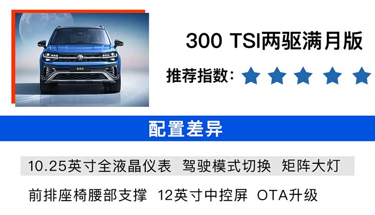 300 TSI两驱满月版售价为18.16万元,也是本次推荐车型。这款车配置增加了10.25英寸全液晶仪表、驾驶模式切换、12英寸中控屏、矩阵大灯、前排腰部支撑、OTA升级等配置,可以说综合配置比较出色,价格也合理。