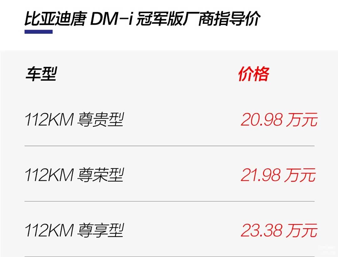 最后再来解答大家关心的购车问题,唐DM-i冠军版共有112KM尊贵型、112KM尊荣型以及112KM尊享型3款配置车型,那么买哪款更划算呢?