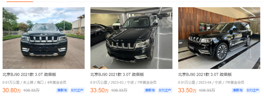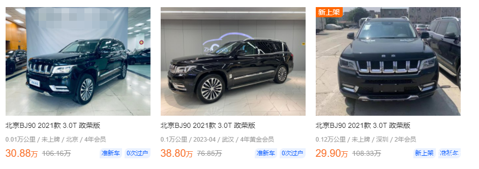 不过,值得注意的是,这些都是一些二级经销商或二手车车商的车源,而并非正规的4S店。同时,根据车商的信息显示,这些BJ90的3.0T政荣版(2021款)车型,其实就是2021年生产的,其库存时间已经超过了2-3年,这意味着这些未上牌的BJ90已经失去了质保。