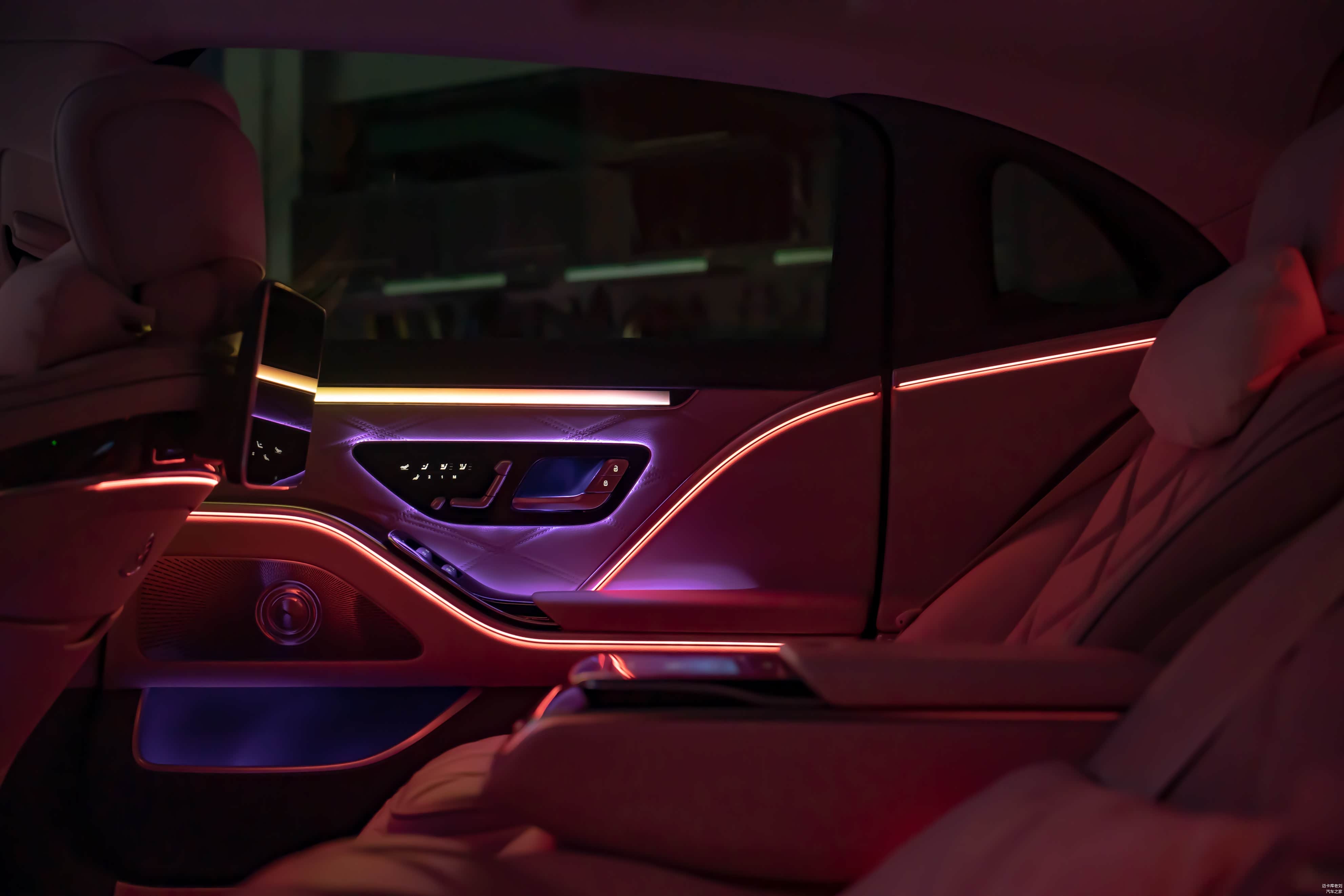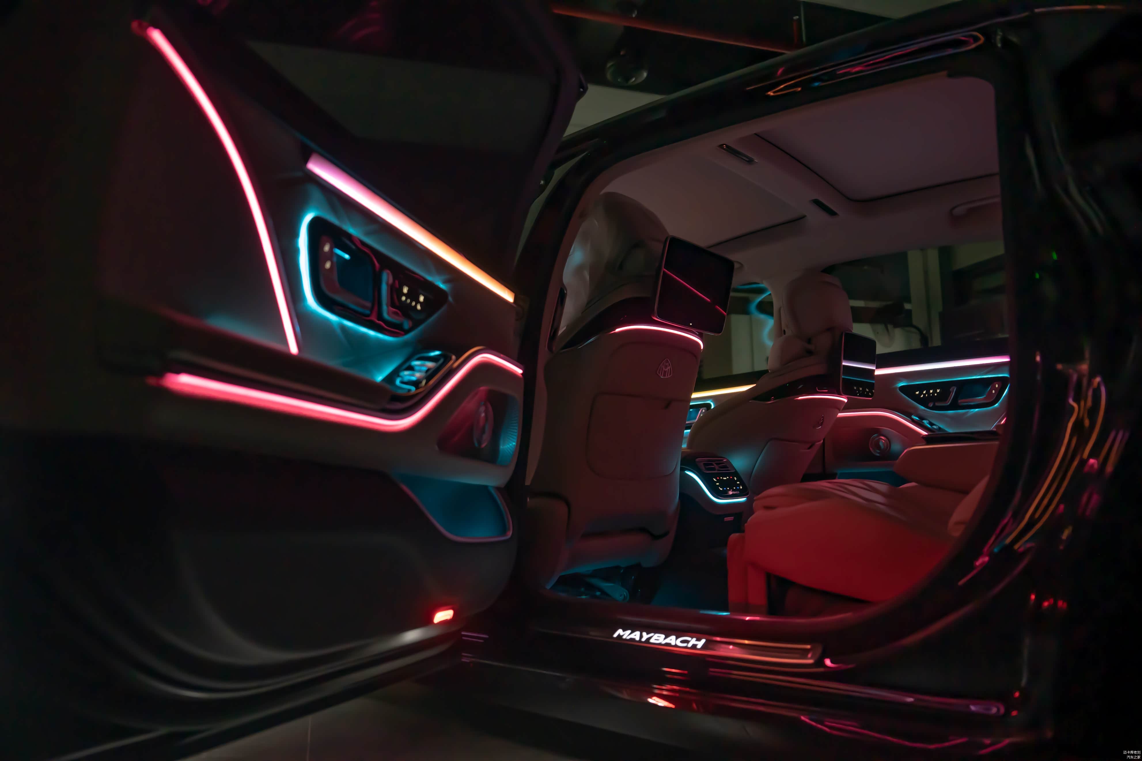 安装完成后的车内氛围灯环境展示,主动式氛围灯赋予了内饰更加绚丽的环境氛围,在夜幕中凸显着迈巴赫S级的奢华贵气。