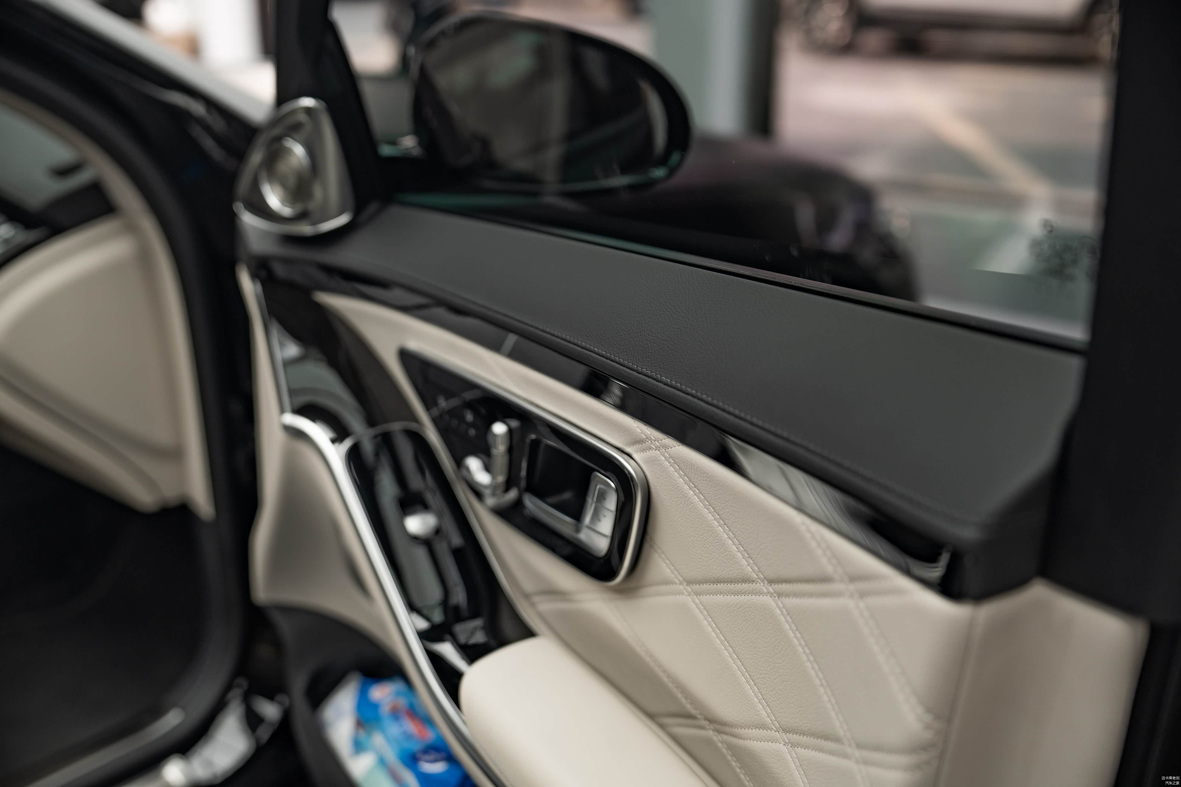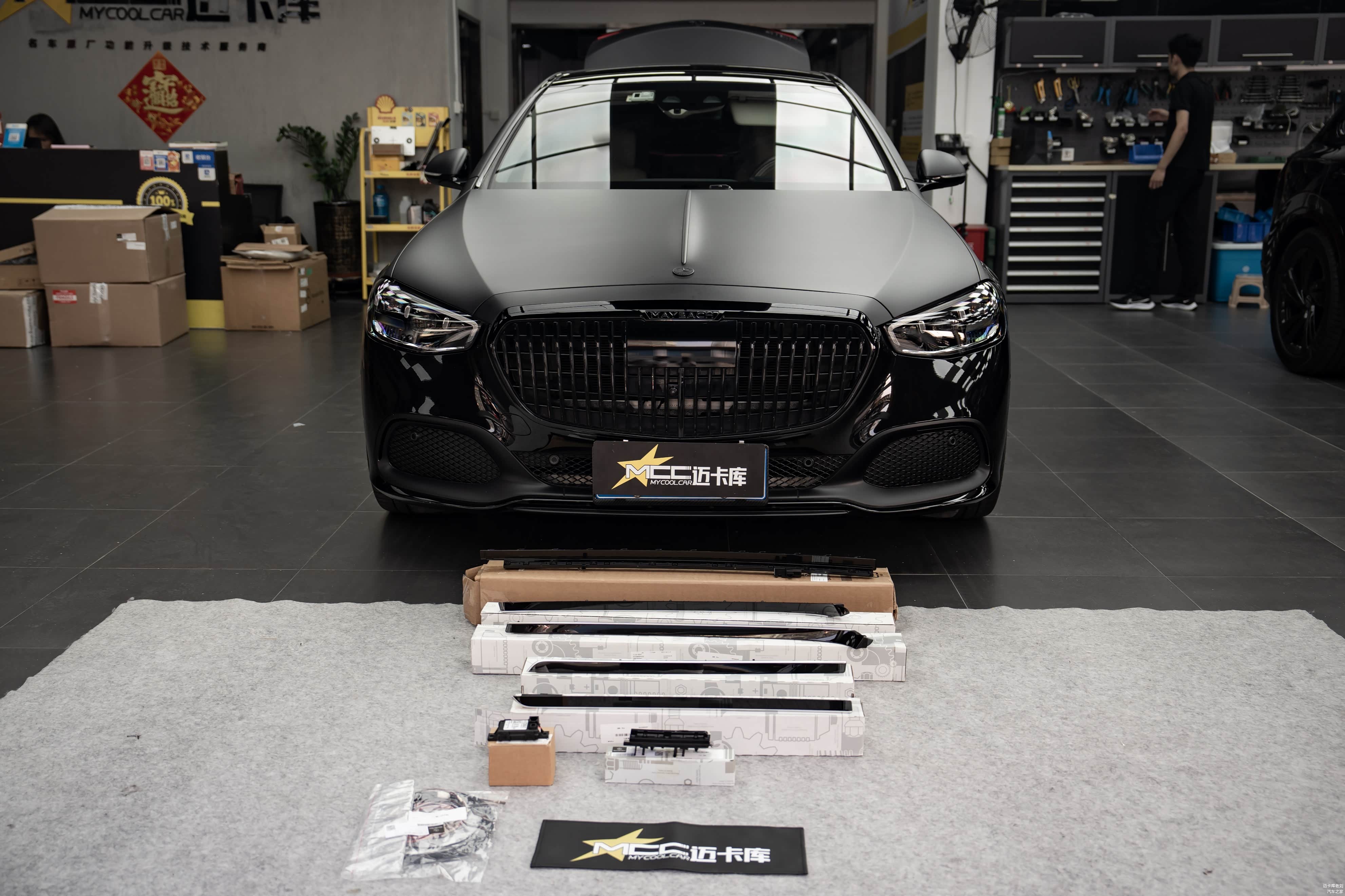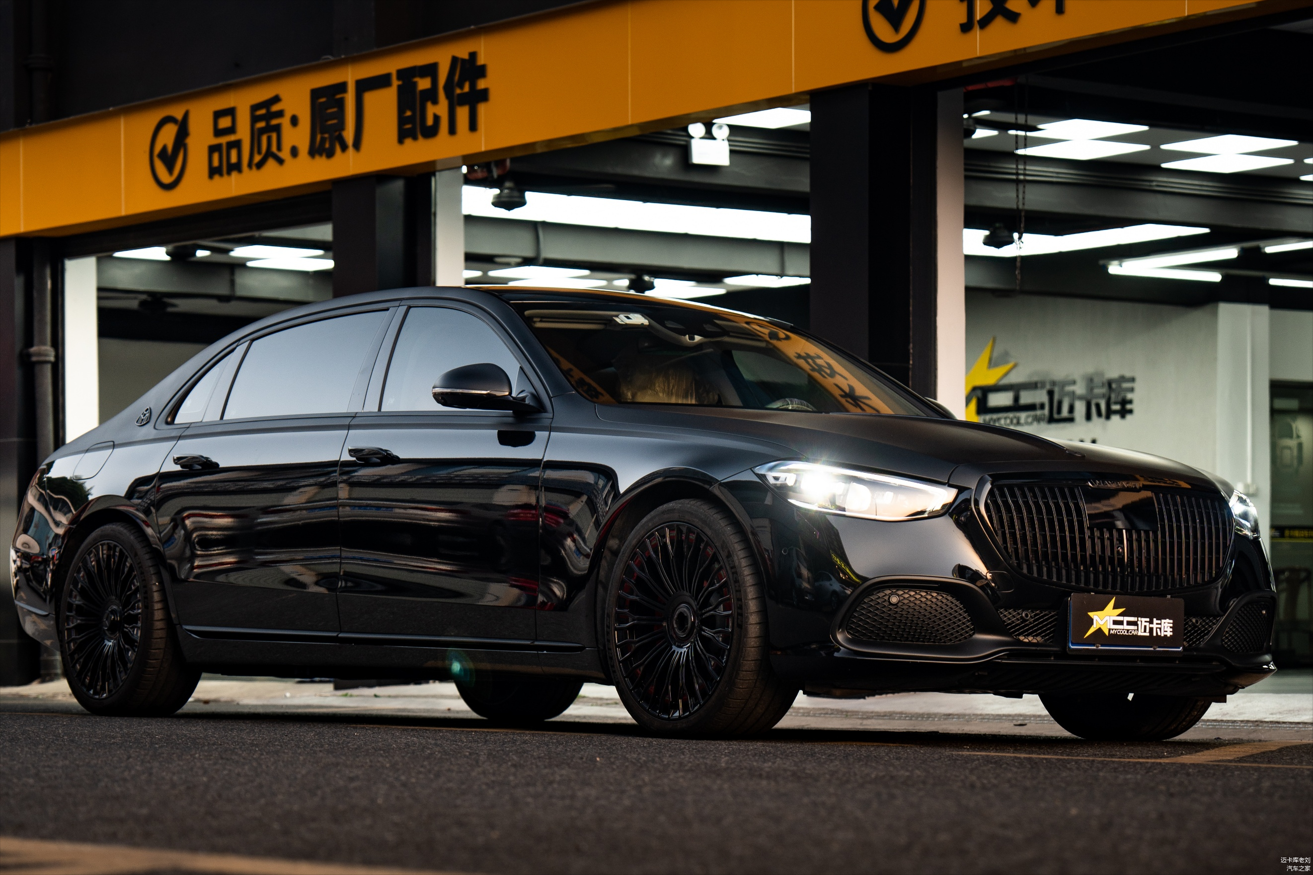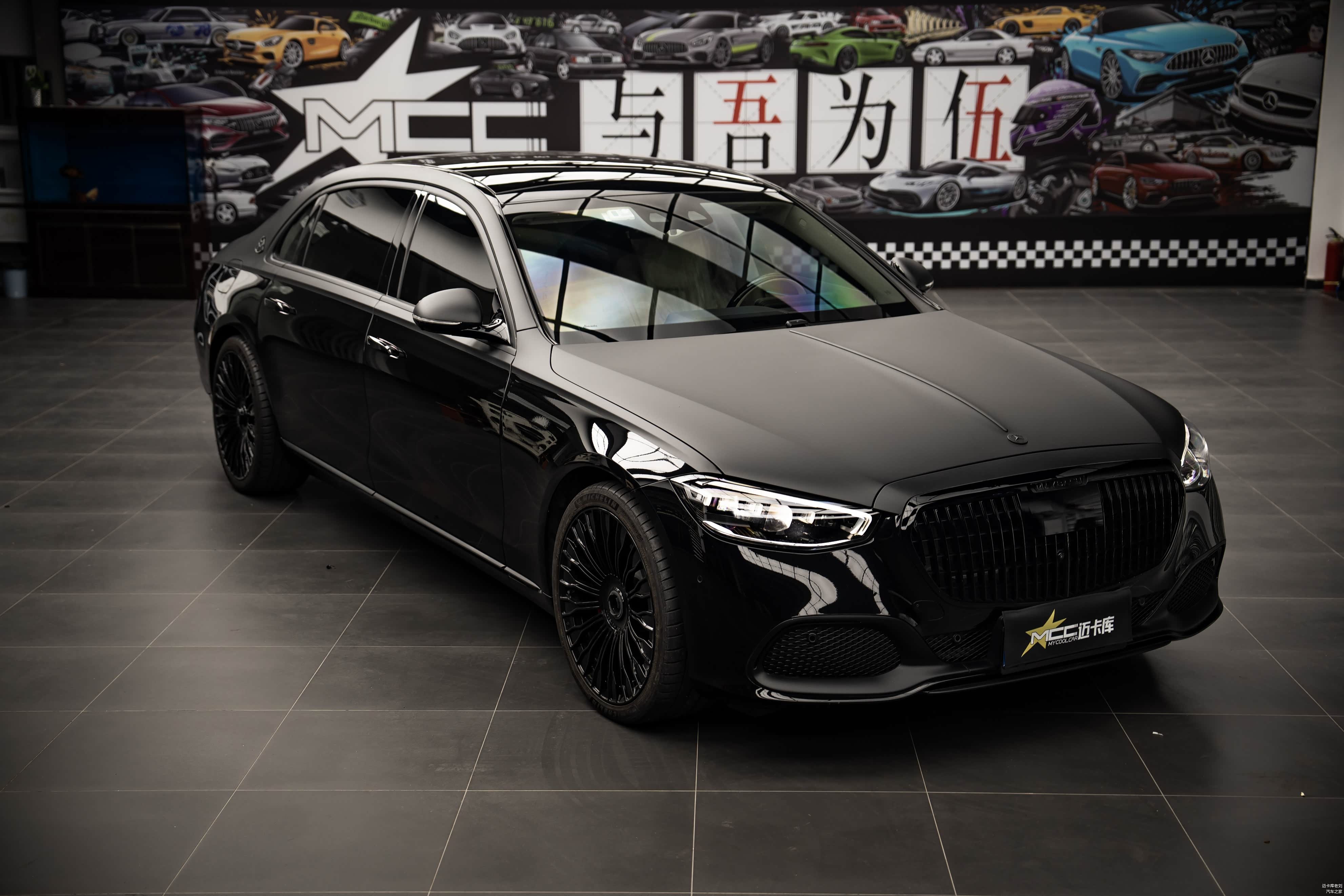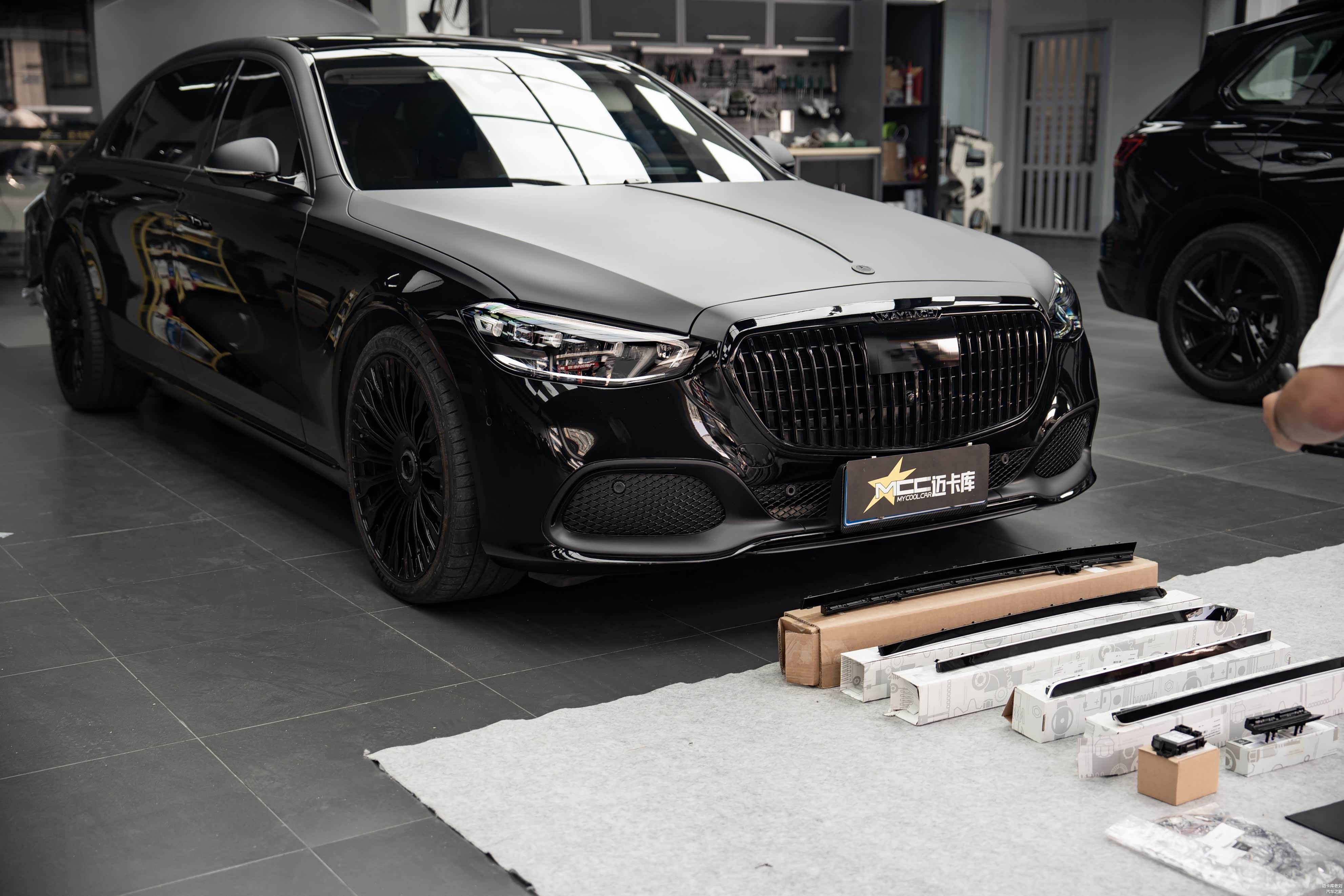 这应该算是全网首台黑化版的迈巴赫S480了,上半身磨砂,下半身亮黑的双拼设计,立标改成卧标,亮黑的进气格栅,极具视觉冲击力。