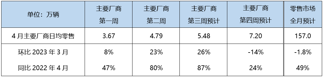 乘联会表示,在疫情等多重不利因素的干扰下,一季度车市表现不佳,呈逐月弱恢复态势。3月份狭义乘用车零售完成159.1万辆,同比和环比分别增长0.5%和14.8%,与此前预测一致。4月价格战热度逐渐消退,消费者恢复理性消费,观望情绪得以缓解,前期压抑需求有所释放,整体车市延续3月底的态势,企稳修复。