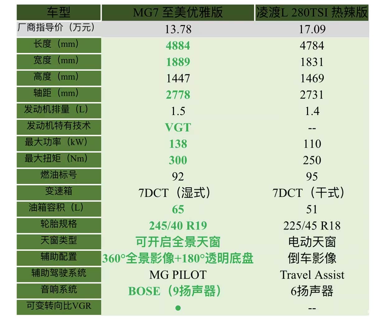 包括我选择X-mode模式之后,它跟2.0T车型的表现几乎就是2台完全不一样的车,如果说2.0T的车型是愤怒与暴躁,那它勉强算的上是黑着脸在生气,尽管整体动力来的更直接,排气也更响,悬架变得更紧,但它那份深埋心中的涵养与礼貌,总在让它克制自己的脾气,不论是乐趣还是动力,它与2.0T车型的表现,夸张点说,就是天壤之别!但这并不妨碍它依旧是这个级别最优秀的选手,就拿280TSI DSG酷辣版的凌渡L来举例,在此之前也算是同级轿跑的王者级选手了吧,但MG7不论是车身尺寸、动力储备,以及辅助配置,都可以以压倒性的优势取得胜利,在这个级别的轿跑车型里,1.5T的MG7可以豪横的说,它的对手只有它2.0T的大哥而已!