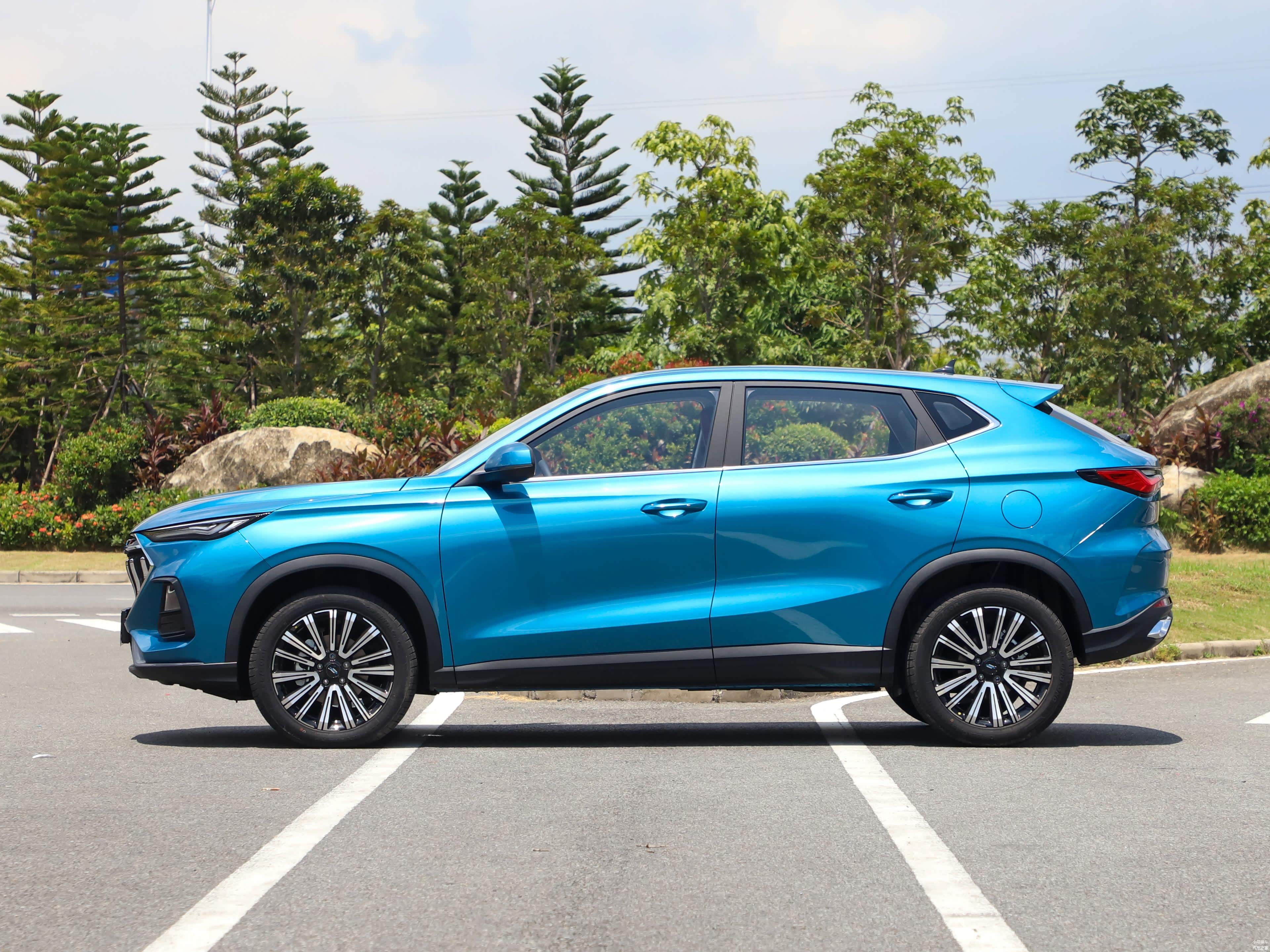 侧面造型方面,车顶略带一点弧度,搭配鲨鱼鳍有效增加了运动气息;腰线采用了分段式设计,点缀出了车身侧面的层次感;轮眉和侧裙部分配备有黑色饰板,带来了一定的力量感;轮毂采用了多辐式造型,带来了比较强的档次感。