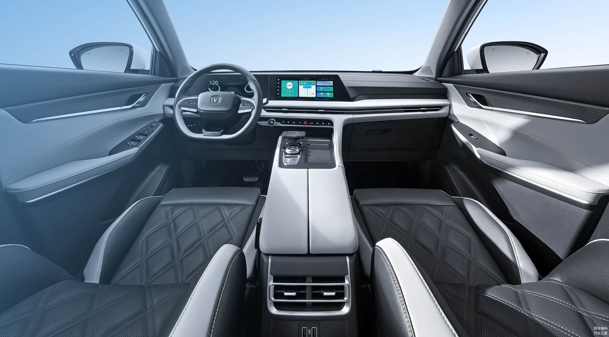 车内采用软质及皮质面料包覆,有黑白、蓝白、黑红三种配色可选。全系配备了12.3寸双屏、无钥匙进入、远程启动、皮质运动座椅、语音识别、车联网、手机APP远程控制。