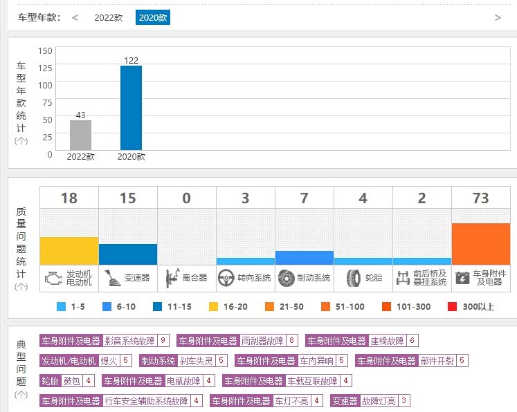 具体来看,在影音系统故障投诉中,有车主投诉流媒体黑屏,还有车主投诉车机无法升级;在雨刷器故障投诉中,有车主投诉雨刷器有异响,还有车主投诉雨刷器不灵敏;在座椅故障投诉中,有车主投诉座椅皮面开裂,还有车主投诉座椅异响;在发动机熄火投诉中,有车主投诉在高速路上正常行驶中,突然发动机自动熄火,整车灯光、启动发动机、电源无任何反应;在刹车失灵投诉中,有车主投诉在停车场出库,准备拐弯上坡时,踩刹车无响应,连续踩了几下刹车没有反应,当时踩下去感觉是空的,直至撞到墙上;在车内异响投诉中,有用户投诉天气一热,大面积出现异响,出风口,方向盘,门板,挡把那个地方,还有很多声音不知道在哪;在部件开裂投诉中,有着关于真皮方向盘掉皮等投诉。