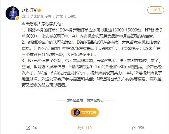 最近,腾势总经理赵长江的一则发文引起了很多人的关注,腾势D9五月份订单量有望达到13000-15000台,而腾势N7新增订单6000+,上市前3万订单,2023年内腾势品牌有机会实现单月破2万销量。