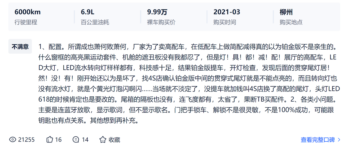 当然,在2年前的车主口碑中,就已经有车主发现了不少细节上的情况: