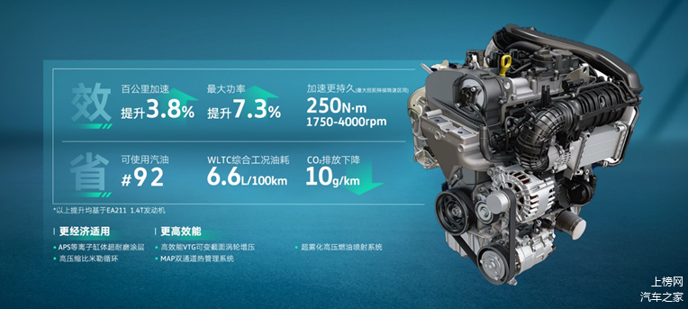 这款全新的1.5T EVO II净效发动机上蕴藏了诸多“黑科技”,包括高效能VTG可变截面涡轮增压、350bar超雾化高频燃油喷射系统、MAP双通道热管理系统等先进技术、APS等离子缸体超耐磨涂层、高压缩比米勒循环等技术,既提升了用车经济性,又降低了二氧化碳排放量,优化了发动机整体效率。