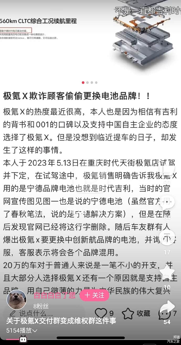 当时官网宣传图也是说宁德电池,但是他随后发现官网已将这行字删除,车友群有人爆出极氪X要更换中创新航品牌的电池,询问客服后,客服表示将会各个品牌混用。该车主极其不满,认为极氪X欺诈顾客,偷偷更换电池品牌。
