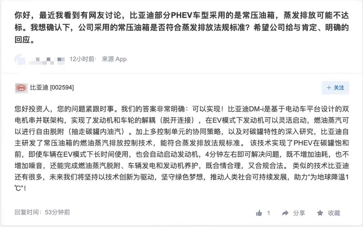 更有意思的是,按照比亚迪的说法,这完全不是问题。在比亚迪公司董秘对投资者的回答中,就表示:“比亚迪拥有先进的技术,通过技术实现了PHEV在碳罐饱和前,即使车辆在EV模式下长时间使用,也会自动启动发动机,4分钟左右即可解决问题,既不增加油耗,也不增加噪音,还能完成燃油蒸汽脱附、车辆发电和发动机养护,既合情合理,又合规合法。”