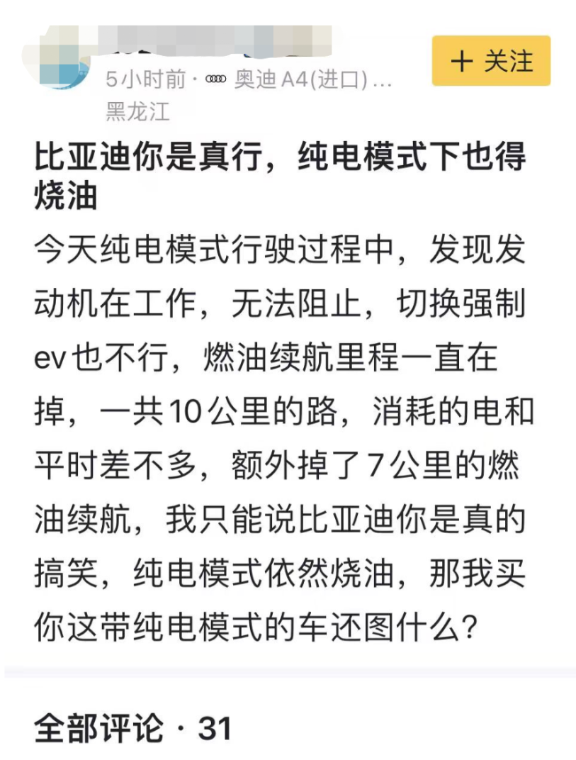 或许有朋友认为,启动发动机4分钟,或许也不是什么太大的问题,但实际上,开过纯电车型的人都知道,纯电车型的安静程度的确比起燃油车出色不少,而在安逸享受的时候,发动机突然跳出来震个好几分钟,真的是要多唐突有多唐突,真的只有车主才能深切体会其中的苦衷。