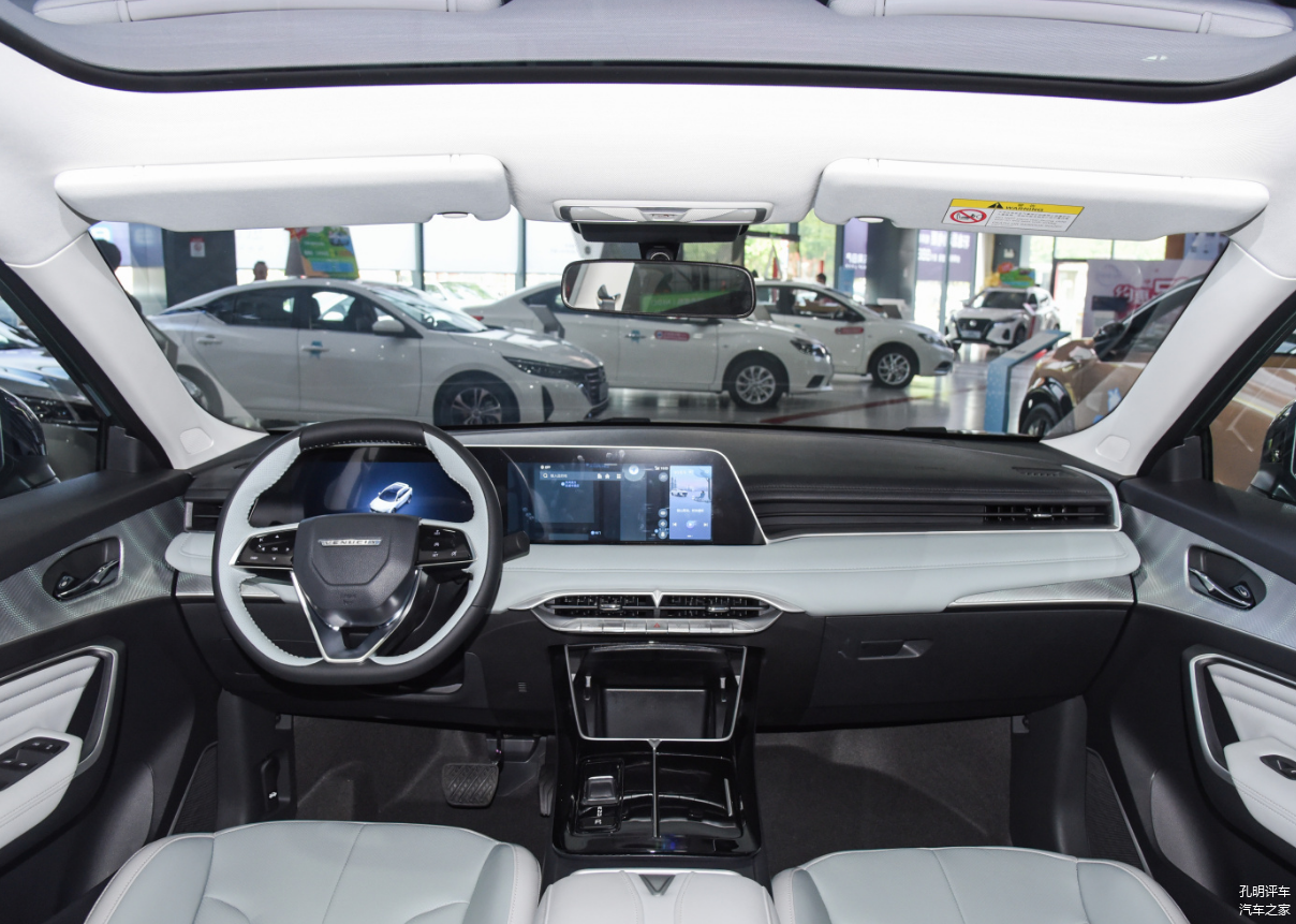 因为是一款主打性价比的车型,所以车内用料以及科技氛围还算不上豪华,不经常接触到的部位会有较多黑色硬塑料质感,但基本的贯穿双大屏配置并不落伍。白色系拼色座椅今年很流行,色调让整个内部空间也显得没那么沉闷。
