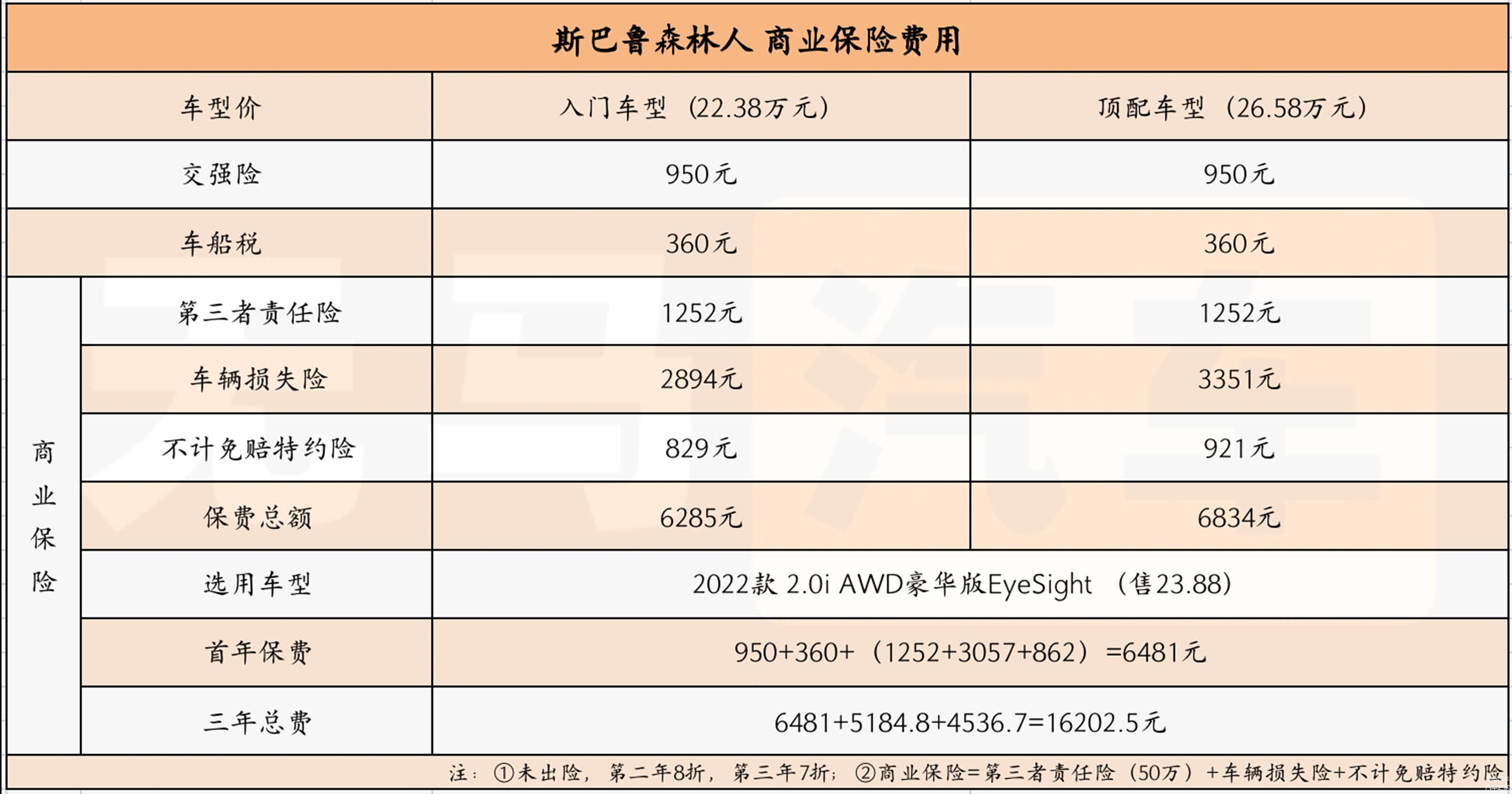 另外,考虑到2022款 2.0i AWD豪华版EyeSight为这4款车型中关注度较高的配置版本,商业保险这一块,我们就以它为参考车型计算相关费用,经过计算,斯巴鲁森林人三年需要在保险方面产生的总费用为16202.5元,平均一年需要分摊约5401元。