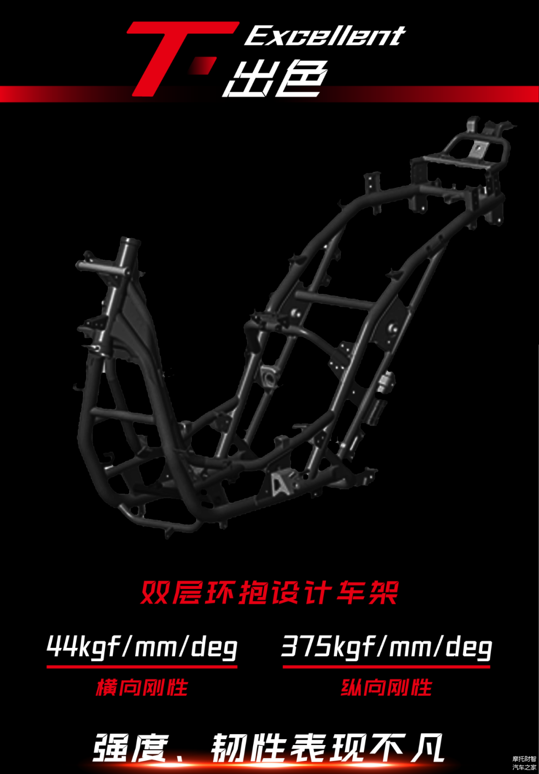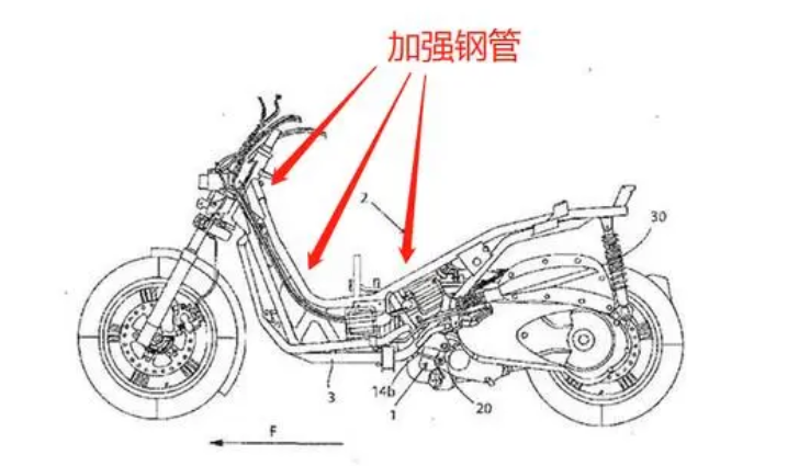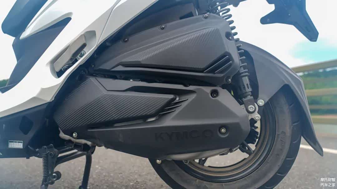 那怎样才能既保留大平踏,又维持良好的操控?光阳交出了一份非常漂亮的答卷,那就是双层环抱式车架。看图中的车架结构,在车头与车尾连接处增加了中脊梁,让车架整体刚度高度接近中梁式车架,但这部分又巧妙设计成了平的,所以覆盖件依然可以做成平踏。那么问题来了:这样的双层环抱式车架,到底能获得中梁式车架几分的操控性?
