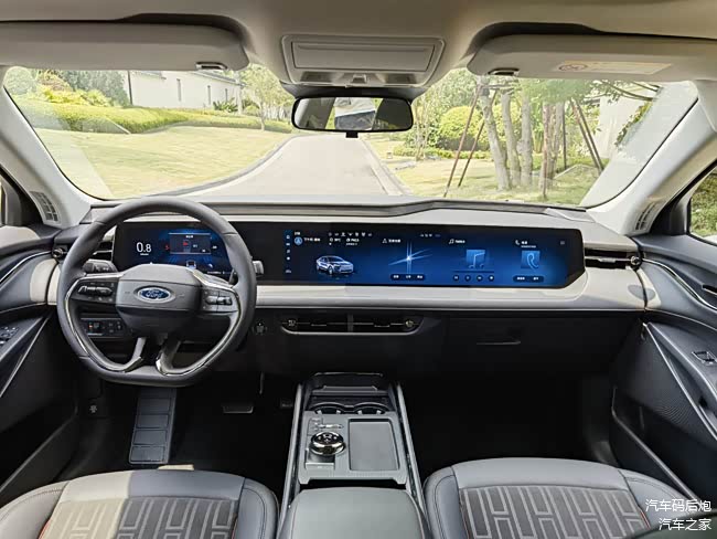 车内同样延续了2.0T车型的风格,依旧采用了长达1.1米的27英寸贯穿式多媒体触摸联屏,内置福特最新一代SYNC+2.0智行互联车机系统,支持多点触控、AI语音识别、手势控制、面部识别等交互方式。
