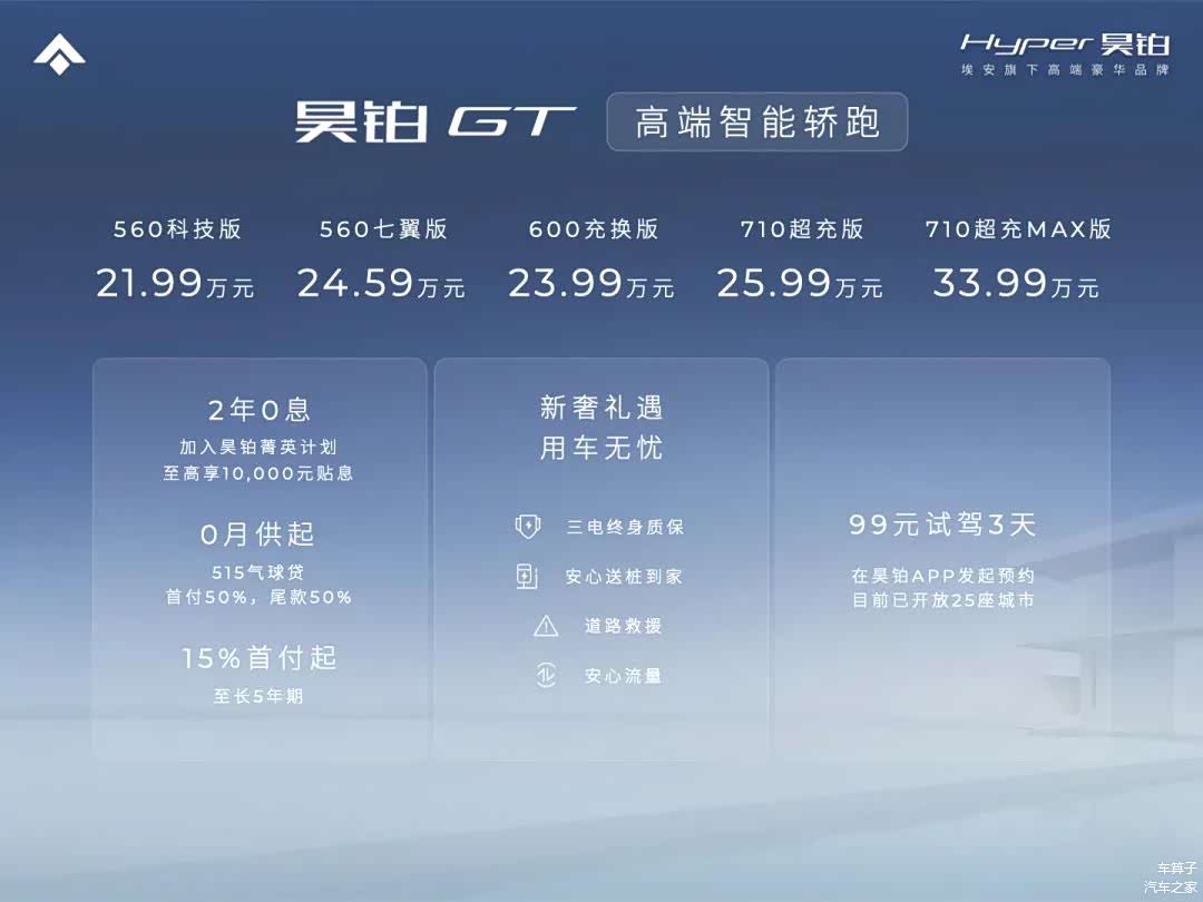 7月3日,埃安昊铂GT正式上市,推出了5款车型,售价21.99-33.99万元。新车基于纯电专属平台AEP3.0以及全新高端电子电气架构——星灵架构打造,主打的是后驱运动型纯电轿车,当然也是想要俘获年轻朋友的心。