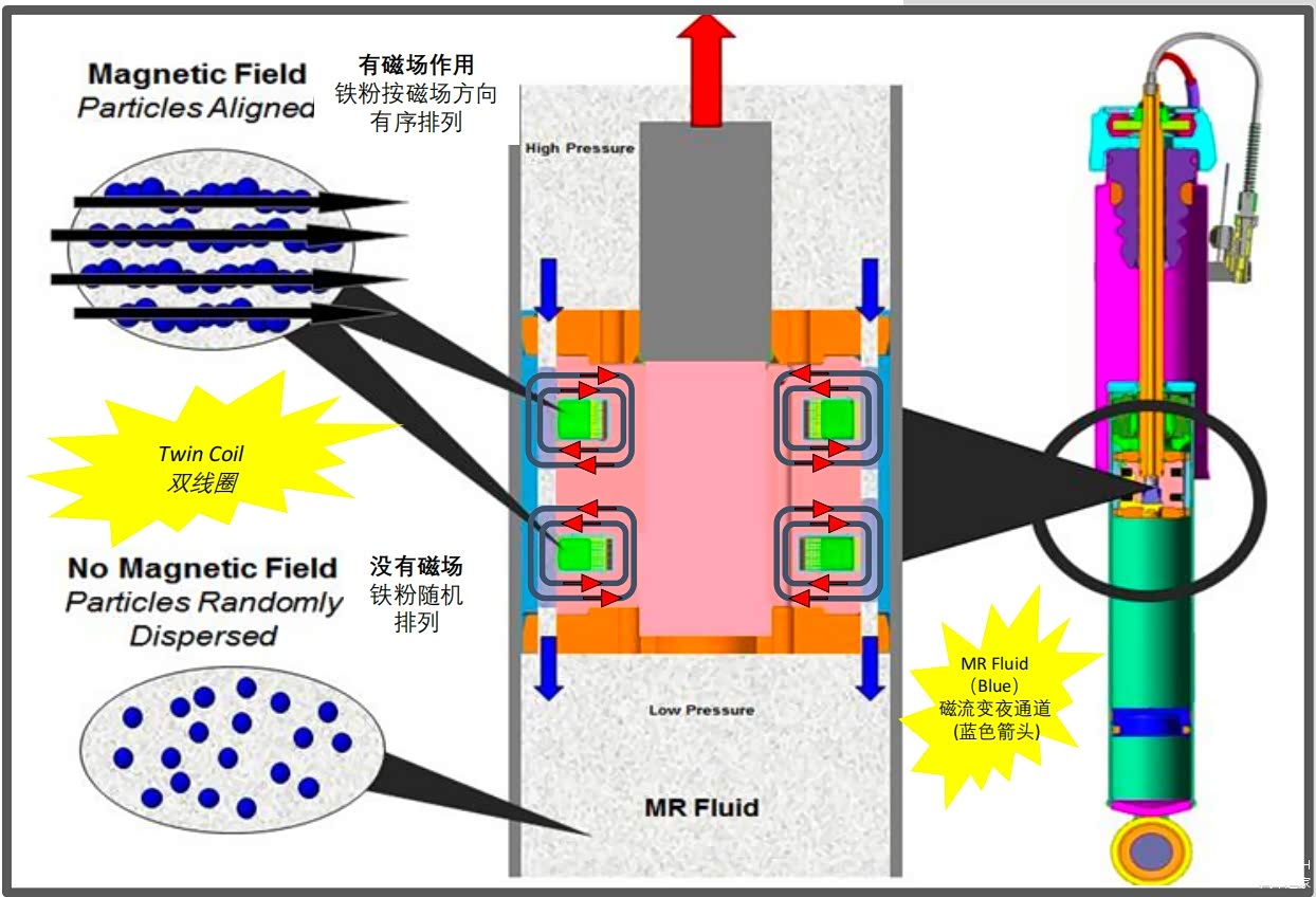 这就是第一重「主动的含义」,MRC的性能调整时间刻度是磁场变化级别的,且每一颗微粒都主动列队,以设定的方式通过阀门,产生对应的阻尼。