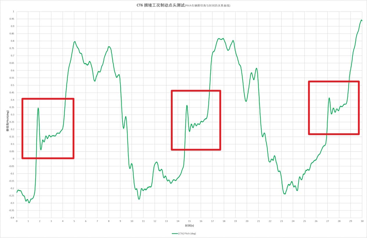 以上是我们中等时速下连续刹车起步模拟高速环路堵车的情况,红框为制动时俯仰角的变化,在第一次峰值后MRC就会调整策略快速收缩抑制点头动作,而这也是如今电动车晕车的重灾区——假如你出差回家坐上一台纯电出租,你应该知道我在说什么。
