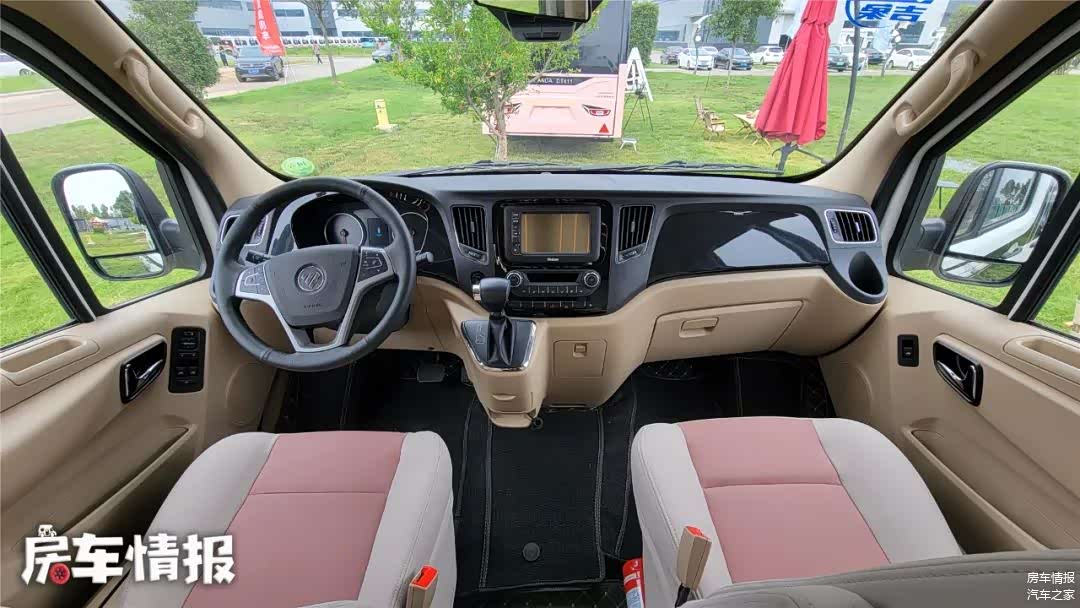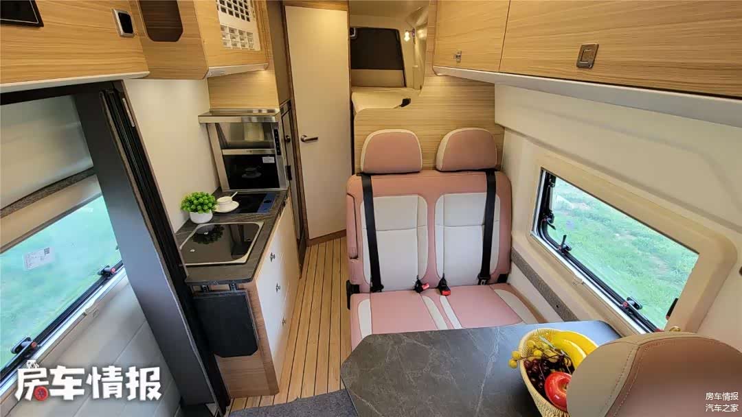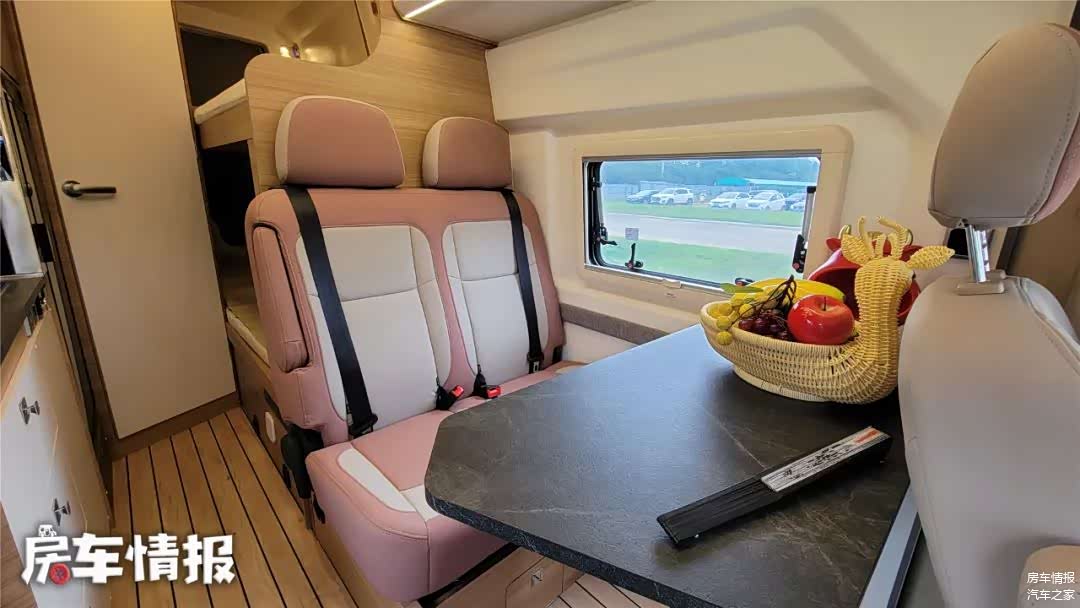 休息区采用双人乘用车座椅,在乘坐时可调整座椅靠背和前后,提升长途乘坐的舒适性,有一点也是我比较喜欢的,那就是驾驶室顶部并没有设计额外的储物柜或者其他设备,如此以来从驾驶室进入生活区会比其他B型房车更方便,不会有碰头的情况发生。