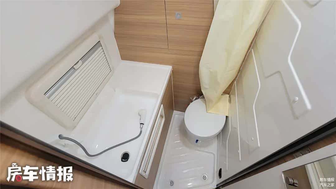 卫生间位于车厢生活区的尾部,内部空间对比同类型房车,明显要大了不少,尤其是洗手盆的尺寸,绝对是B型房车之最,之所以能做到这么大,是因为这款车卫生间上方空间加入了外凸式侧盲窗的设计,除此以外,卫生间内部还提供了盒式马桶、储物空间等基础设备,能够满足日常使用。