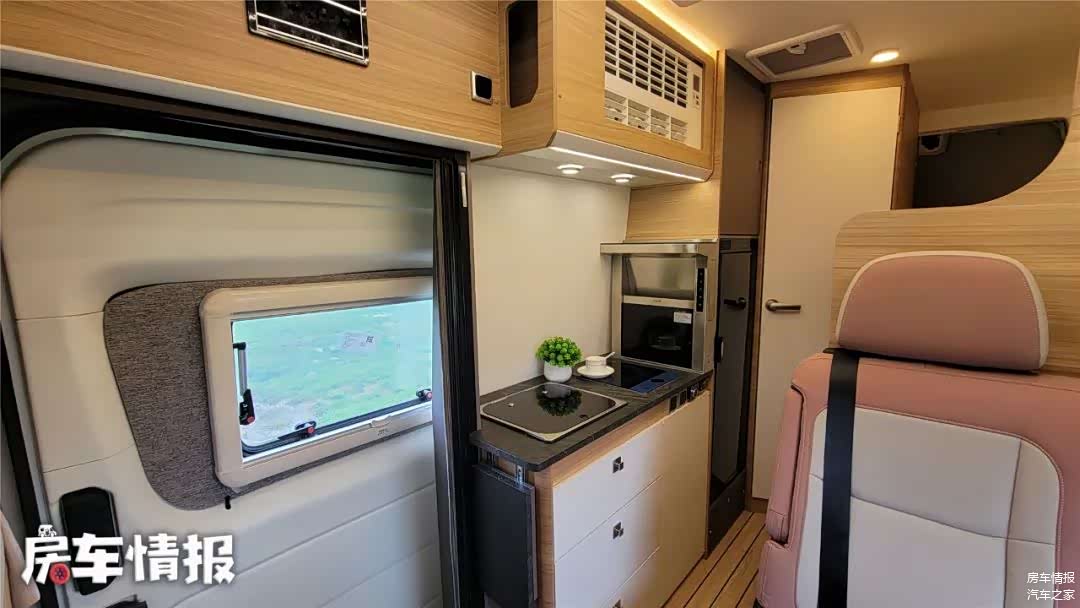 尽管内部空间不是很大,但内部依然提供了一套可以媲美C型房车上的厨房设备,大吸力抽油烟机、电磁炉、洗菜盆以及118升房车专用冰箱等,可以保证在车内制作自己喜欢的美食或简餐。