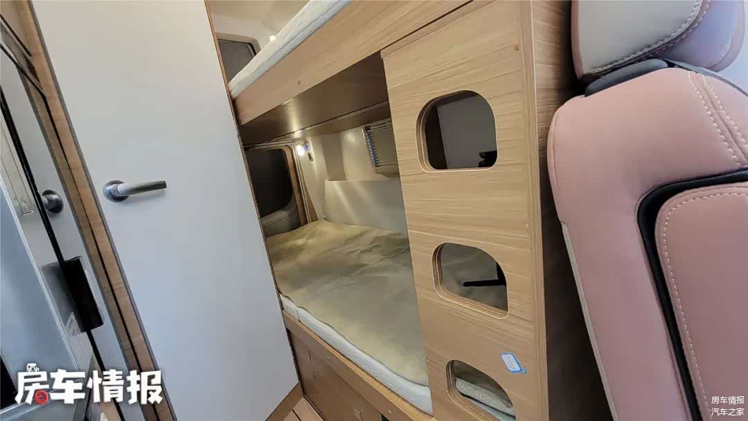 关于睡卧区,这款车提供了是一组纵置上下双层单人床,上层床铺的尺寸为2040*700毫米,下层床铺尺寸为2080*800毫米,均可以满足一名成年人使用,另外上下床的头部空间表显都挺出色,实际体验后发现并不会有明显压抑感。除了纵置床,还可以在生活区顶部选装一台电动升降床,一次来拓展睡卧区。