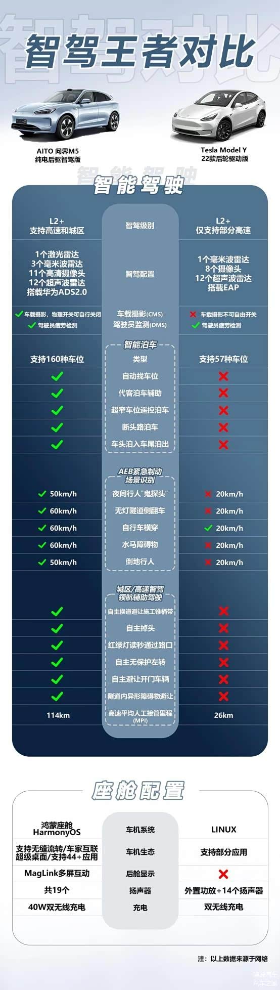 首先我们来看一下两款车型在智能驾驶方面的对比。问界M5智驾版搭载了全新的HUAWEI ADS 2.0高阶智能驾驶系统,可以支持高速和城区,而特斯拉Model Y只能在部分高速上启用辅助驾驶模式。问界M5智驾版配备了顶置激光雷达、毫米波雷达、摄像头和超声波雷达等多种传感器,可以对各种复杂场景下目标物体的准确感知,而特斯拉Model Y的感知硬件配置相对简单一些。在智能泊车以及AEB紧急制动场景识别方面,问界M5智驾版占有很大的优势。