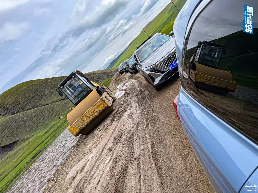 特别是在非铺装路面行驶时,SUV的优势尽显,突然出现的坑洼路段大大增加了通行难度,雨后的路面十分泥泞还容易打滑。轱辘哥看到,几乎所有的车辆外观都是比较肮脏的。而到了可以俯瞰大草原的山坡上,除了良好的通过性外,动力性能也十分重要。