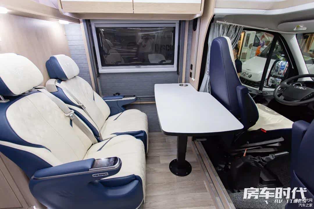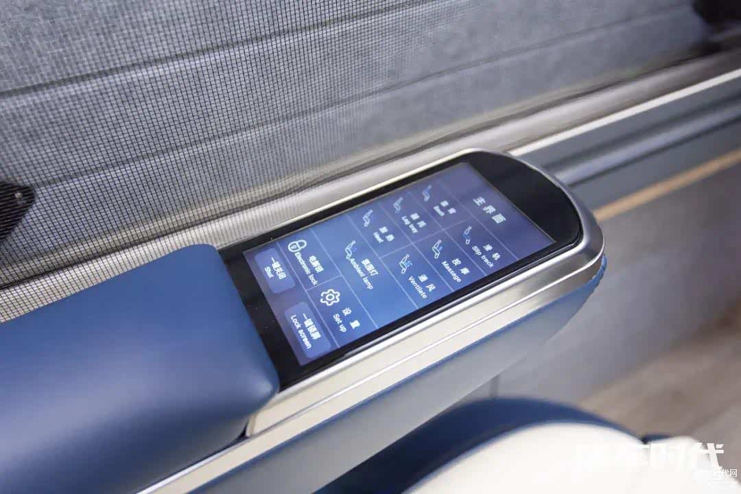 主副驾驶座椅采用的是真皮包覆的双扶手气悬座椅,用户乘坐后可以根据自身的情况调节座椅的高度。座椅符合人体工学设计,能够缓解久坐疲劳。其中单人副驾驶可以180度旋转,与后方会客区形成一个更好的交互空间。