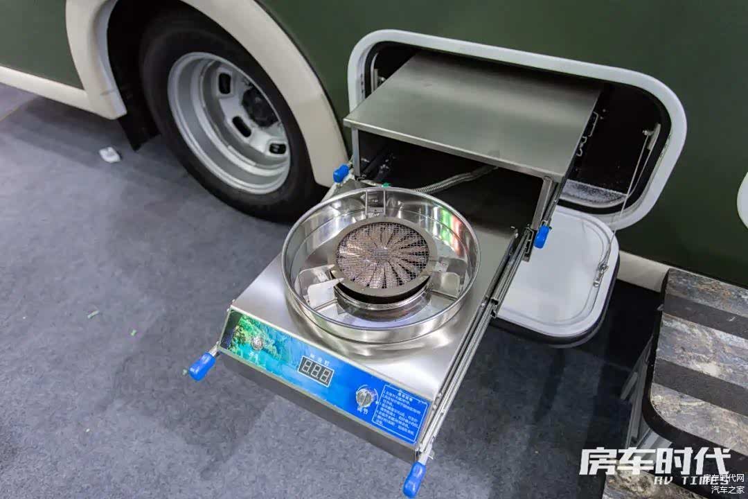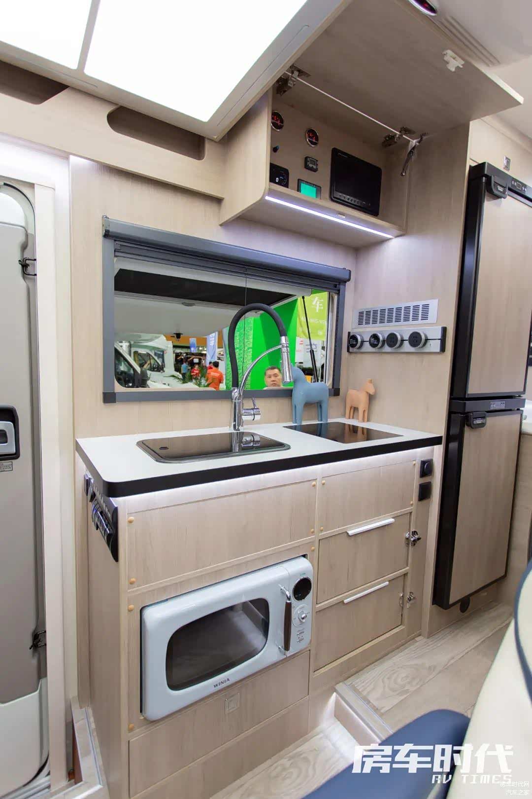 厨房区配置齐全,操作台面上配备有方形带盖水池以及内嵌式电磁炉,顶部设有抽油烟机,避免车内制餐油烟堆积。