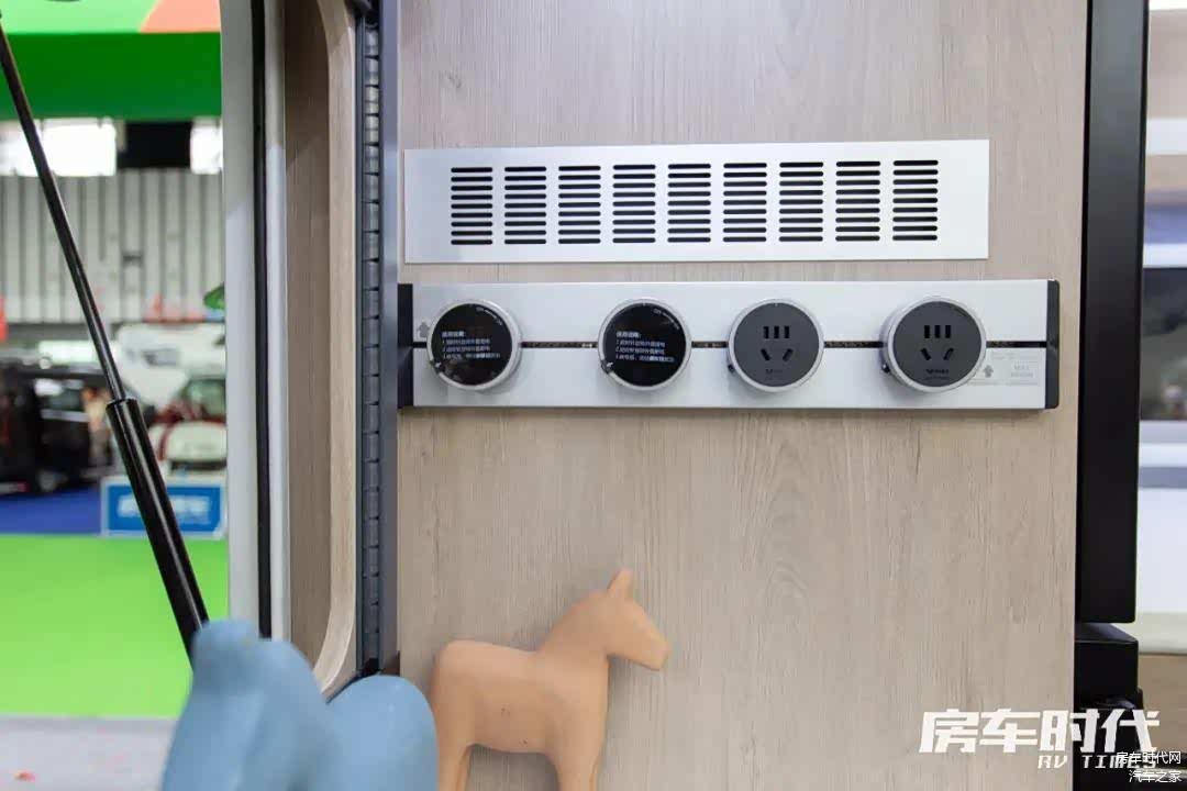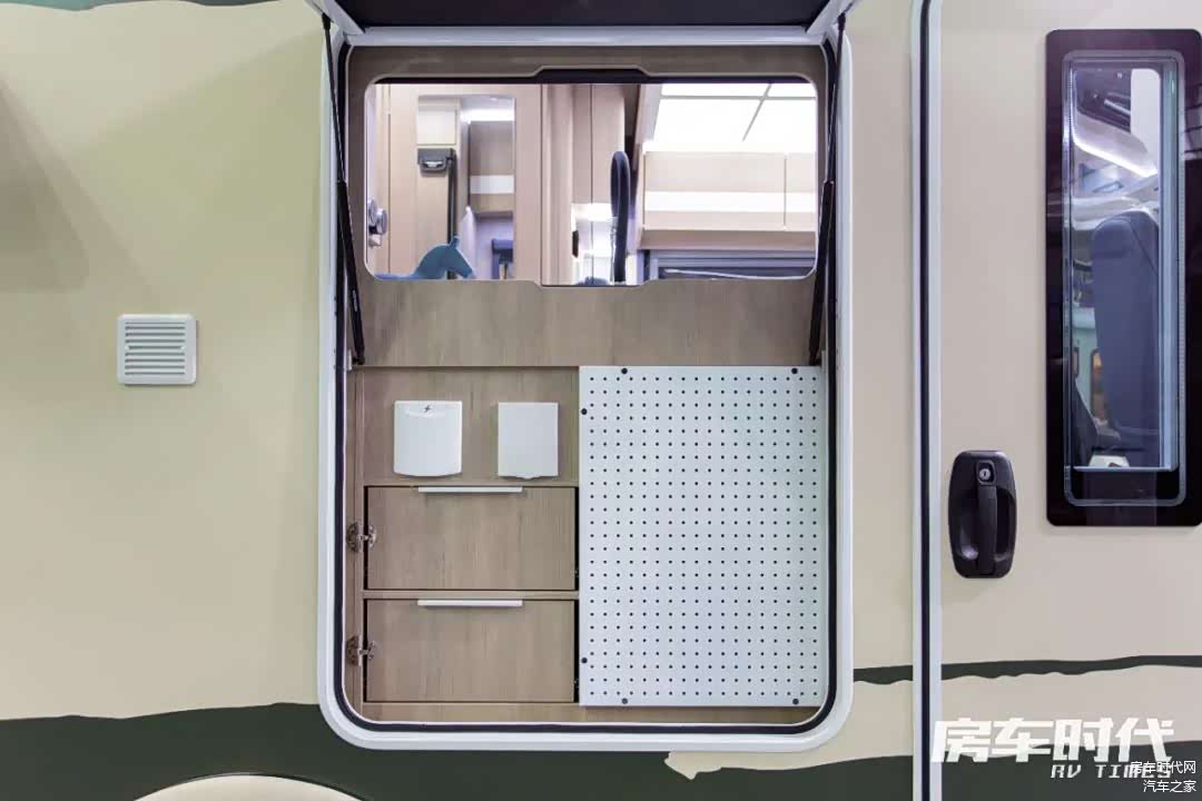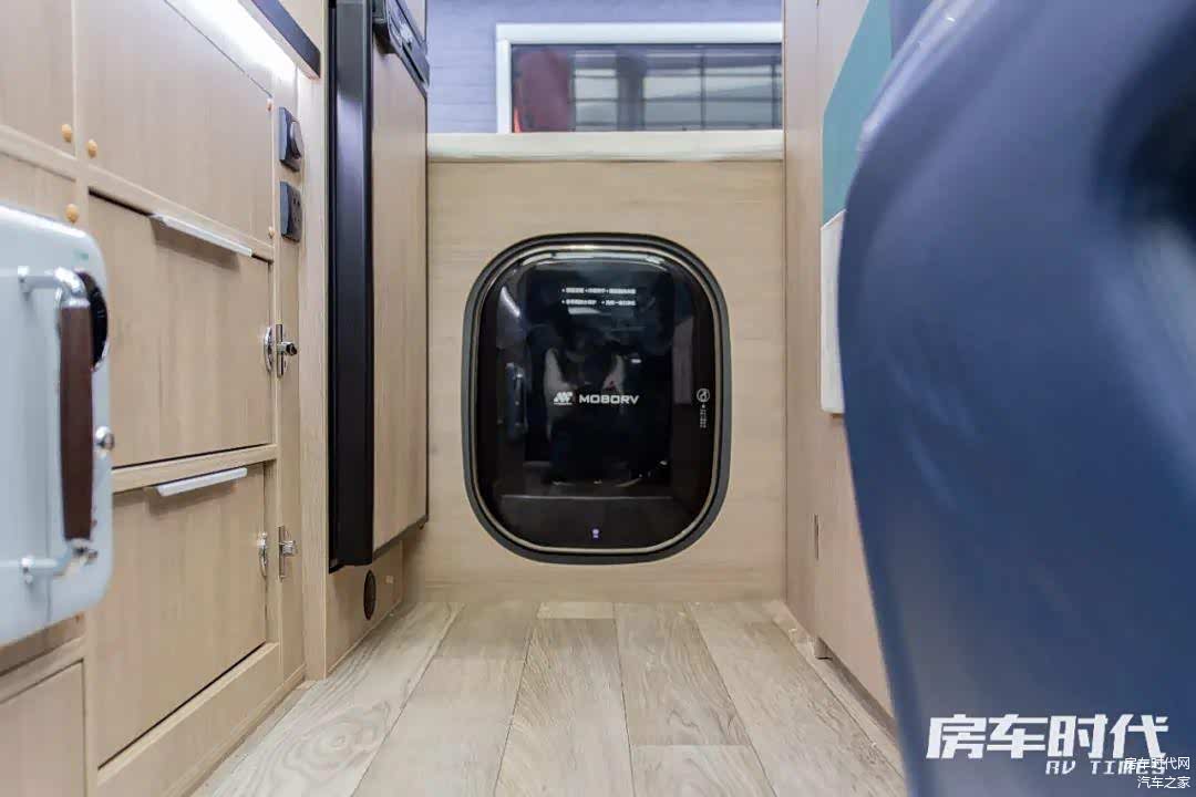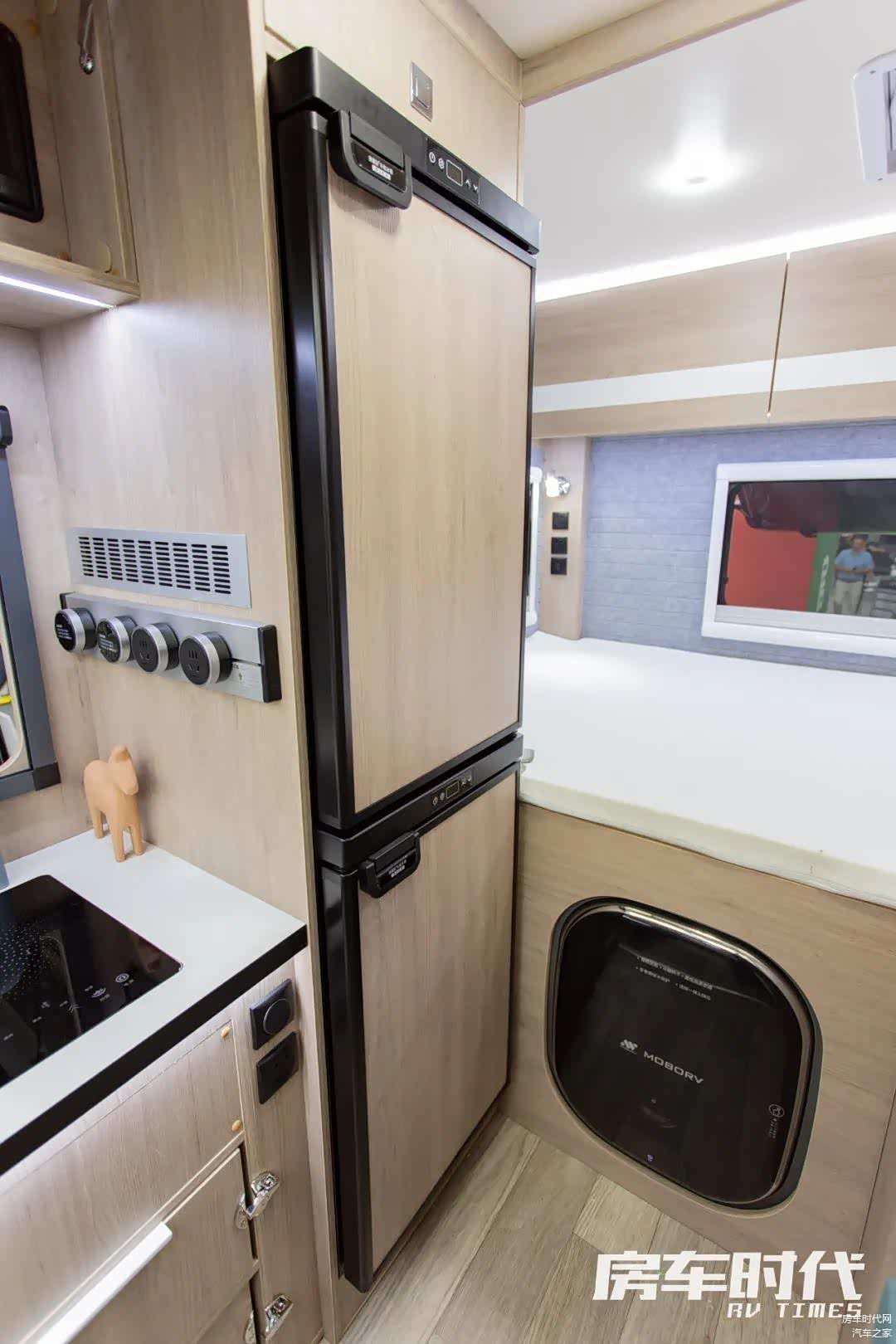 橱柜右侧内嵌有一台152L车载冰箱,可将食物冷冻冷藏收纳。橱柜侧面为整车的中控系统,方便进出时操作。