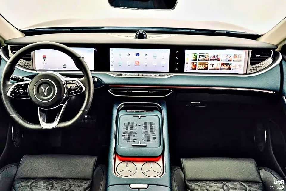 这块一体式三联屏:长度达到1066mm,升降范围30mm,可结合车内模式自动调整升降。屏幕内置高通8155芯片,采用7纳米制程,拥有8核处理器,算力达8TOPS。