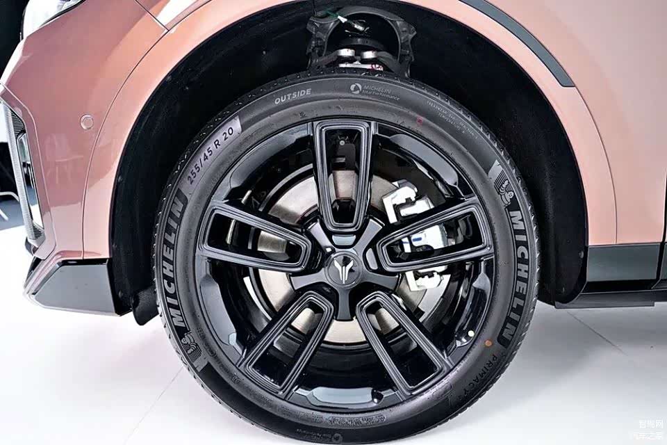 轮辋使用了全新双五幅亮黑样式,看着非常漂亮,至于轮胎则全系搭载了米其林PRIMACY4浩悦四代轮胎,尺寸:255/45 R20,市场参考价约为2000元/条,主打舒适、安静。