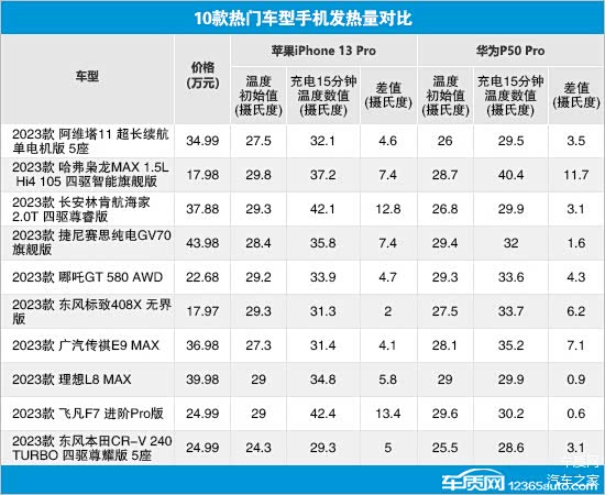 总体来看,阿维塔11和哪吒GT在该测试环节中表现抢眼,无论对苹果iPhone 13 Pro还是华为P50 pro充电,温差均控制在相对较低的水平。相比之下,虽然东风标致408X对于苹果iPhone 13 Pro充电的温度控制出色,但换成华为P50 pro后,表现就有些不尽如人意。