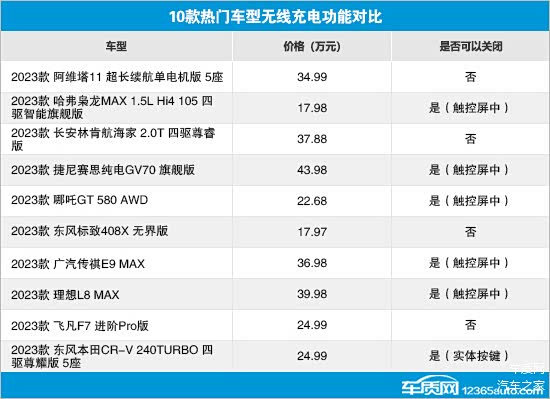在无线充电功能对比中可以发现,10款车型中有6款车型的无线充电功能支持手动关闭。其中,东风本田CR-V车型的表现可圈可点,其无线充电功能的开关为实体按键,且位于无线充电板的左下角,便于驾驶者查找与盲操。而哈弗枭龙MAX、捷尼赛思纯电GV70、哪吒GT、广汽传祺E9以及理想L8的无线充电功能开关均设置在中控屏当中,且功能并不在一级菜单内,用户查找起来较为不便,如果能配备独立的实体按键,想必操作会更加方便。