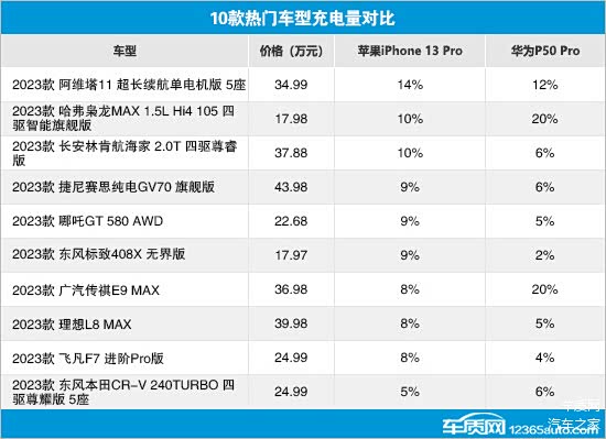 总体来看,对于苹果和华为快充协议都支持的阿维塔11和哈弗枭龙MAX在该测试环节表现抢眼,为苹果iPhone 13 Pro和华为P50 Pro充电15分钟后,电量均达到或超过10%。而东风本田CR-V、飞凡F7以及东风标致408X综合表现要略逊色于其它测试车型,在充电测试环节中对于苹果iPhone 13 Pro和华为P50 Pro都不太友好,可见这三款车型的无线充电功能并不支持任何快充协议。