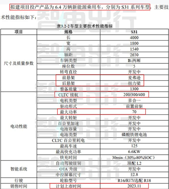 S31为两厢5座车型,前后悬分别为麦弗逊与扭力梁式。新车将推出CLTC续航200km/300km/400km共3个版本,配备磷酸铁锂电池,最高充电功率6.6kW,快充模式下30-80%电量需30分钟。