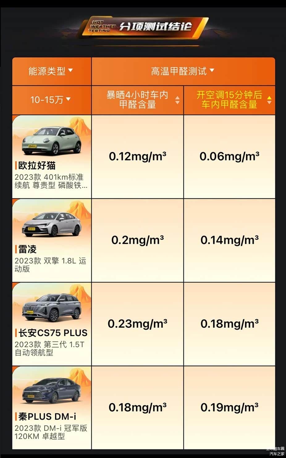 正是缘于2023款欧拉好猫在“健康”上做足了功课,近期在某权威汽车媒体平台的高温甲醛测试环节中,暴晒4小时后,欧拉好猫车内甲醛含量仅0.12mg/m³,开空调15分钟后车内甲醛含量降至0.06mg/m³,在10-15万级别车内空气甲醛剩余含量最低,位列榜首。这一成绩也充分证明了欧拉好猫在甲醛排放控制方面的卓越品质,为消费者提供了一款值得信赖的高品质车型。