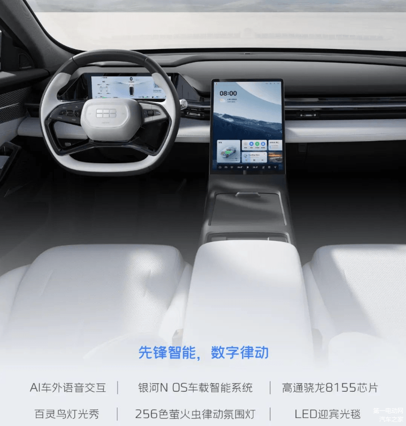 内饰方面,新车全系标配13.2英寸触控高清中控竖屏+10.25英寸全数字液晶仪表、电子怀挡、墨镜遮阳板等豪华配置。并且首次搭载了吉利全栈自研的全球首个汽车行业全场景AI大模型,并全系标配高通骁龙8155芯片、银河N OS智能操作系统等智能技术,集成感应解锁无感启动、AI车外语音交互、手机APP远程控制系统、全域OTA云端升级等丰富科技配置。